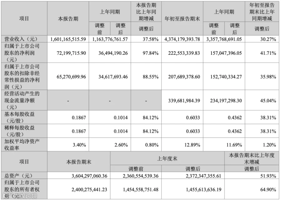 2023年前三季度,公司实现营业收入43.74亿元,同比增长30.27%,归属于上市公司股东的净利润2.23亿元,同比增长41.71%,归属于上市公司股东的扣除非经常性损益的净利润2.08亿元,同比增长35.98%