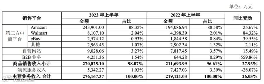 亚马逊一直是该公司最重要的电商平台。截至2023年上半年,赛维时代通过亚马逊平台实现了24.39亿元的收入,同比增长25.67%,占公司总收入的比例达到了88.32%