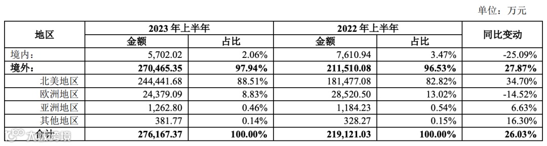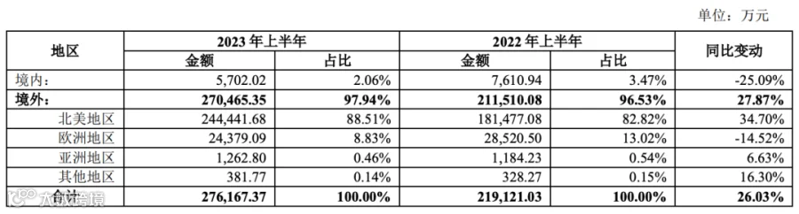 从区域分布的角度来看,北美地区一直是该公司的主要市场。今年上半年,赛维时代在北美地区实现了24.44亿元的收入,占据了总收入的88.51%