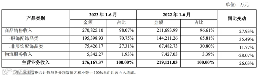 从收入分布来看,服装配饰品类是公司收入占比最大的类目,2023年上半年收入达到19.54亿元,占比70.75%。非服装配饰品类收入7.54亿元,占比27.71%