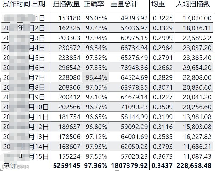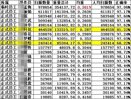 扫描正确率=一次扫描数/总扫描票数。临时工多处理重件,轻件由计件员工完成。个别员工票量少、正确率低,增加返工成本,建议处罚[k]。