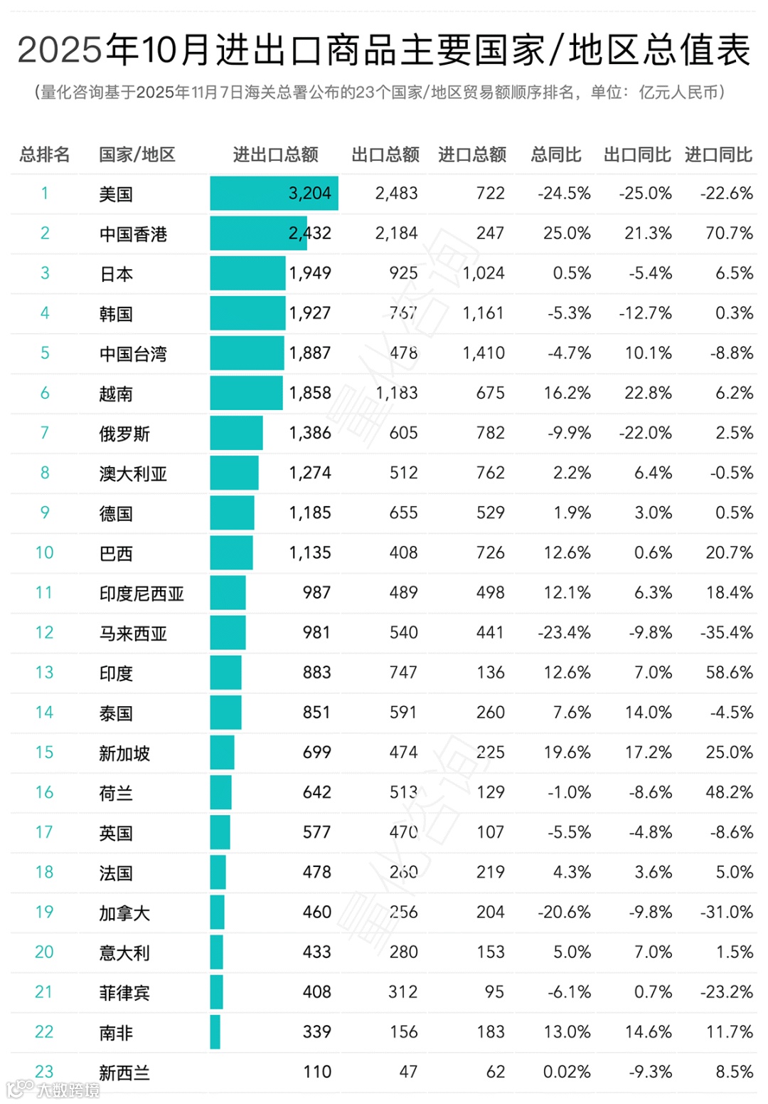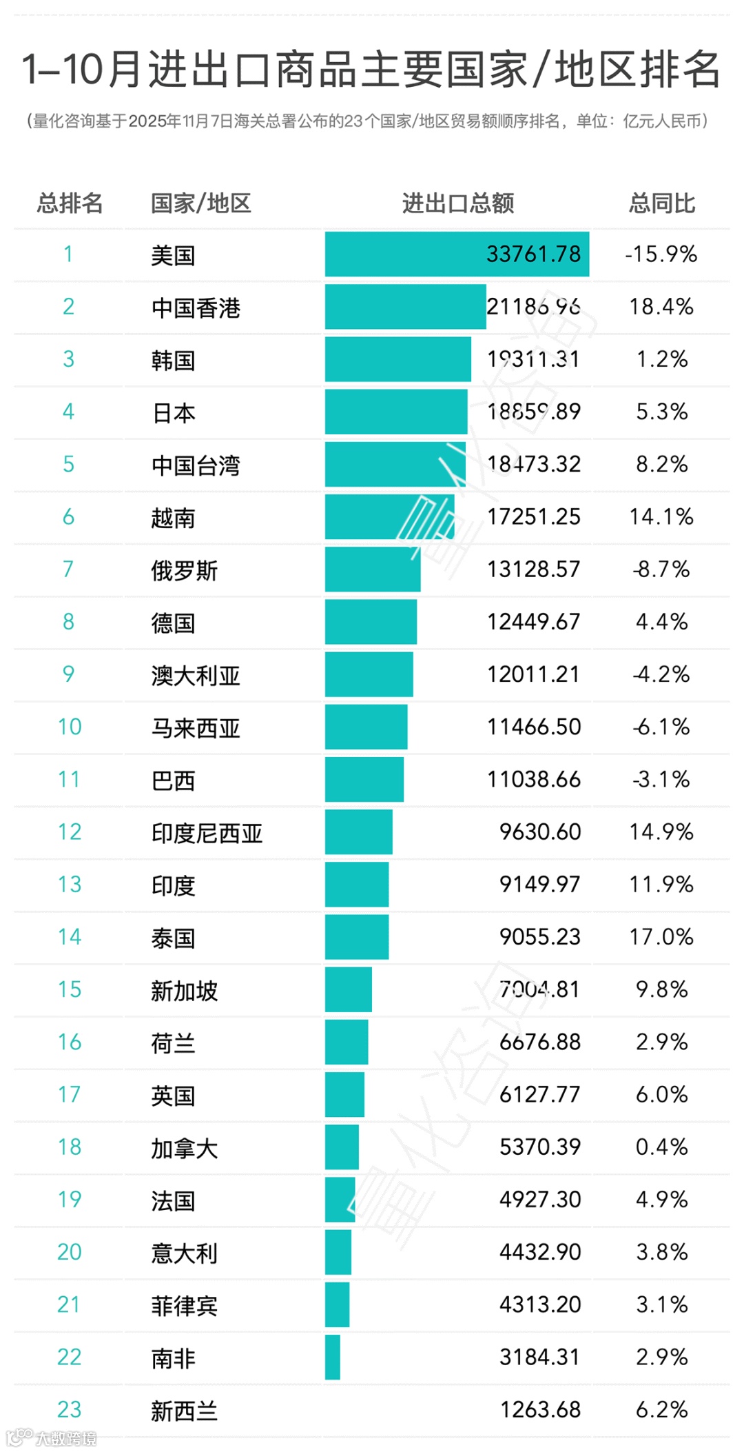 本文量化咨询将基于2025年10月份数据及1-10月汇总数据进行分析排名,主要维度为:10月数据及排名、1-10月进出口数据及排名、1-10月出口数据及排名、1-10月进口数据及排名和区域组织联盟占比等。(注:本文排名仅为2025年11月7日海关总署已公布的23个国家/地区贸易额顺序排名,并非所有国家/地区贸易额真实排名)