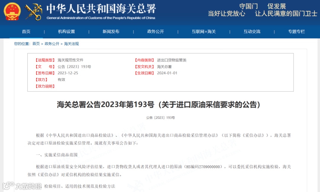 近年来,海关总署已陆续针对进口服装、水泥、原油、人造板等商品发布第三方采信政策。其中,针对进口原油的采信要求,依据《海关总署关于进口原油采信要求的公告》(2023年第193号,以下简称《公告》)执行,核心流程与优势如下:
