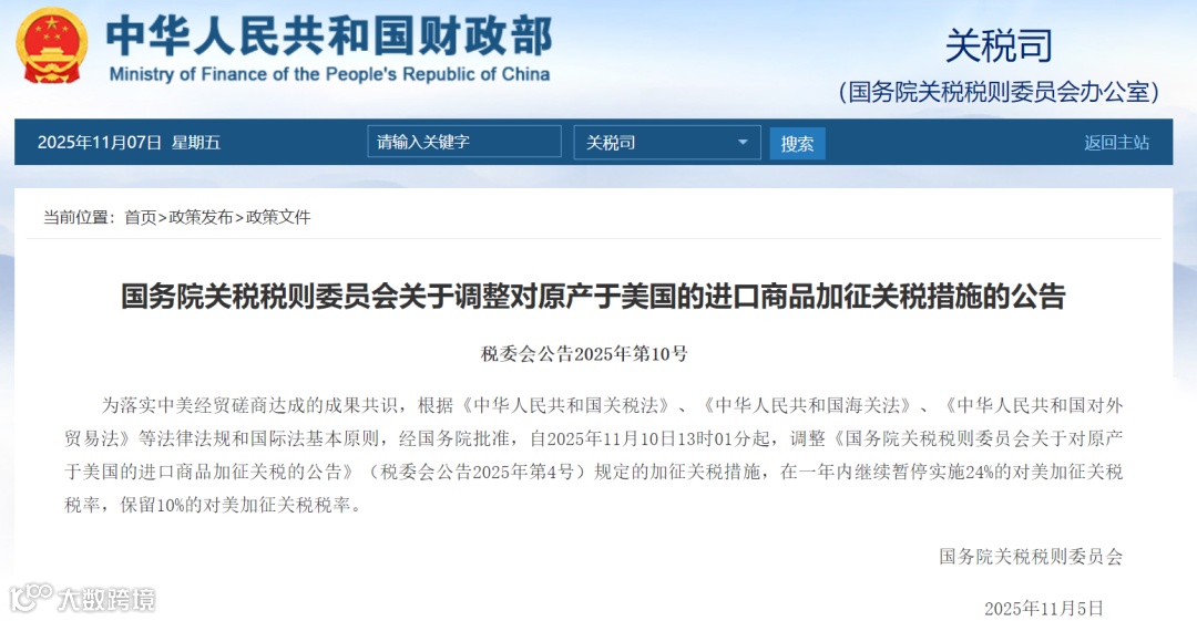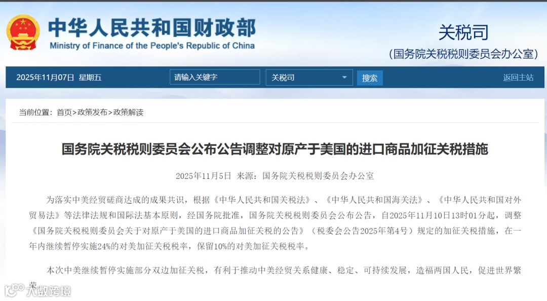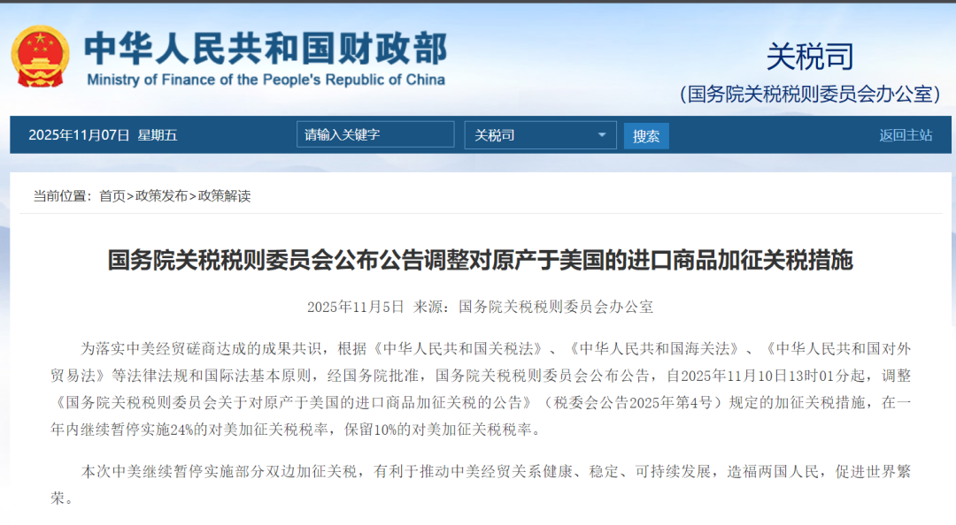 2025年11月5日,国务院关税税则委员会发布两则公告,明确对美经贸反制措施的调整细节,核心调整聚焦关税政策优化,具体要点如下: