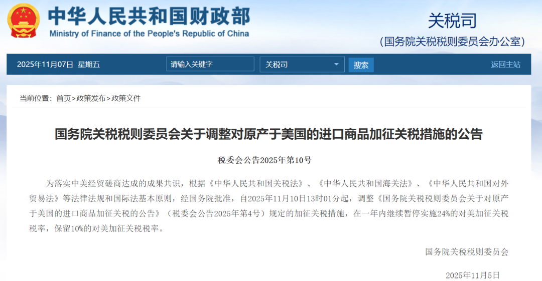对等关税维持10%加征,为期一年:自2025年11月10日13时01分起,调整《国务院关税税则委员会关于对原产于美国的进口商品加征关税的公告》(税委会公告2025年第4号)相关规定,在一年内继续暂停实施24%的对美加征关税税率,仅保留10%的加征税率。此前中美互制对等关税合计34%,本次调整后实际执行税率大幅降低。