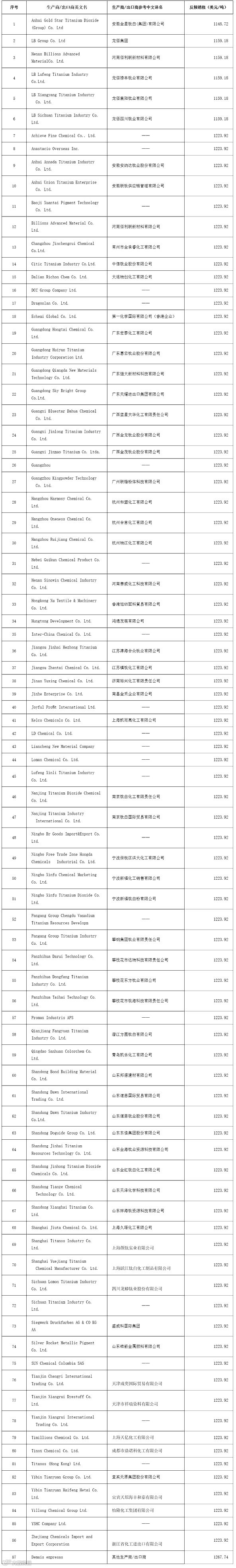 附表:巴西对华二氧化钛征收反倾销税表