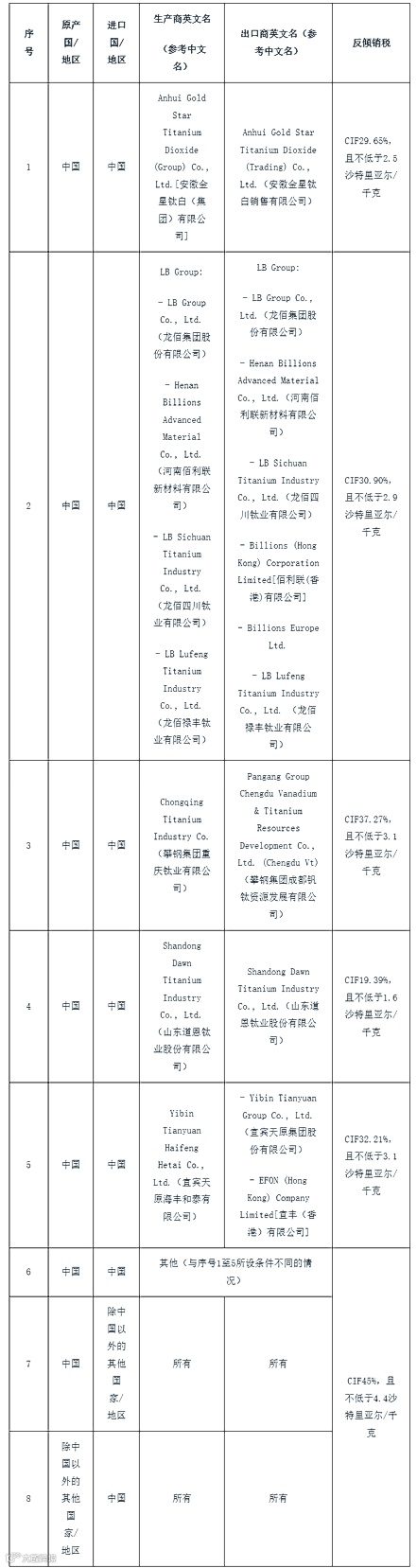 附表:沙特对华二氧化钛反倾销终裁征税表