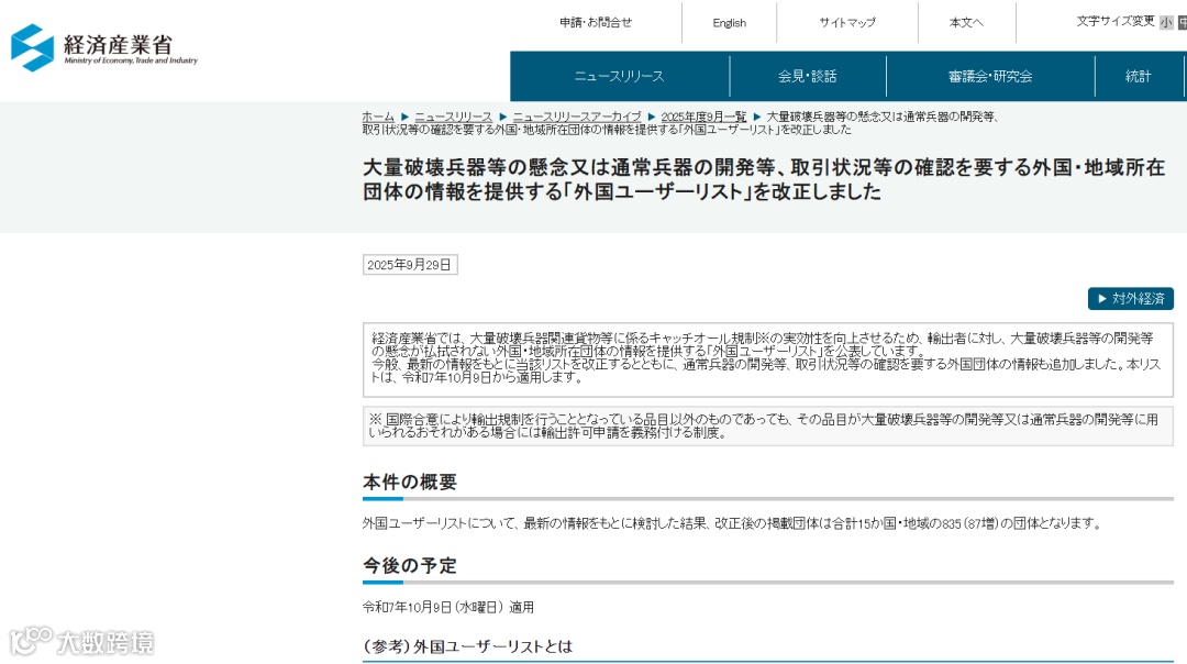 2025年9月29日,日本经济产业省(METI)更新了“最终用户清单”(Foreign End User List),新增21家中国企业/机构,同时移除2家。新规将于10月9日正式生效。