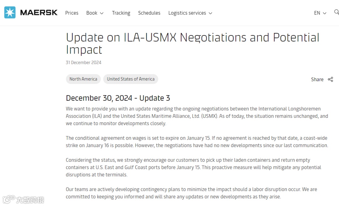 马士基在最新公告中表示,美东港口劳资谈判目前无实质进展,建议发往美国东部及墨西哥湾沿岸港口的客户尽快安排在1月15日前提空箱[k]。市场消息称,相关谈判将于1月7日重启[k]。