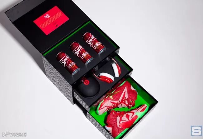 早期的 LeBron 12 曾特意制作了 100 个特制大礼盒,由一个特殊鞋盒包装,同时还附带 3 瓶专为詹姆斯调校的雪碧 Mix 和 1 副 Beats 耳机。