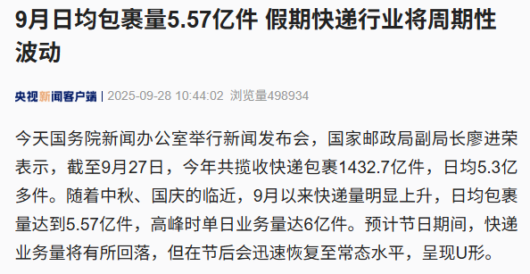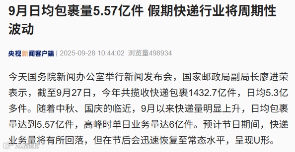 面对节前包裹量飙升(进入9月以来,日均包裹量更是攀升至 5.57亿件,单日峰值已突破 6亿件)的洪峰,官方已部署多项措施: