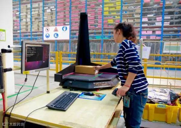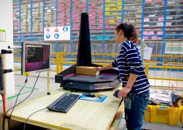 2)商品测量:亚马逊的Cubi Scan仪器会对新入库的中小体积商品测量长宽高和体积,根据这些商品信息优化入库。例如鞋服类、百货,新的爆款等等,都可以直接送过来通过Cubi 测量直接入库。这给供应商提供了很大方便。客户不需要自己测量新品,这样能够大大提升他的新品上升速度;同时有了这个尺寸之后,亚马逊数据库可以存储下这些数据,在全国范围内共享,这样其他库房就可以直接利用这些后台数据,再把这些数据放到合适的货物里就可以收集信息,有利于后续的优化、设计和区域规划。