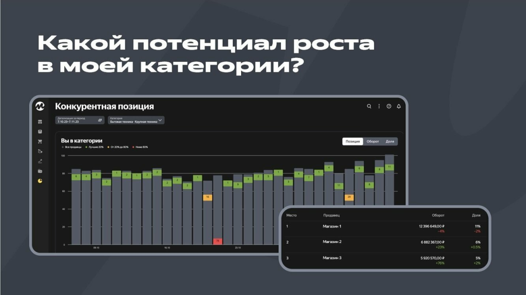 而 Yandex Market 的 “分析”→“竞争地位” 板块,能帮你把竞品数据看得更透: