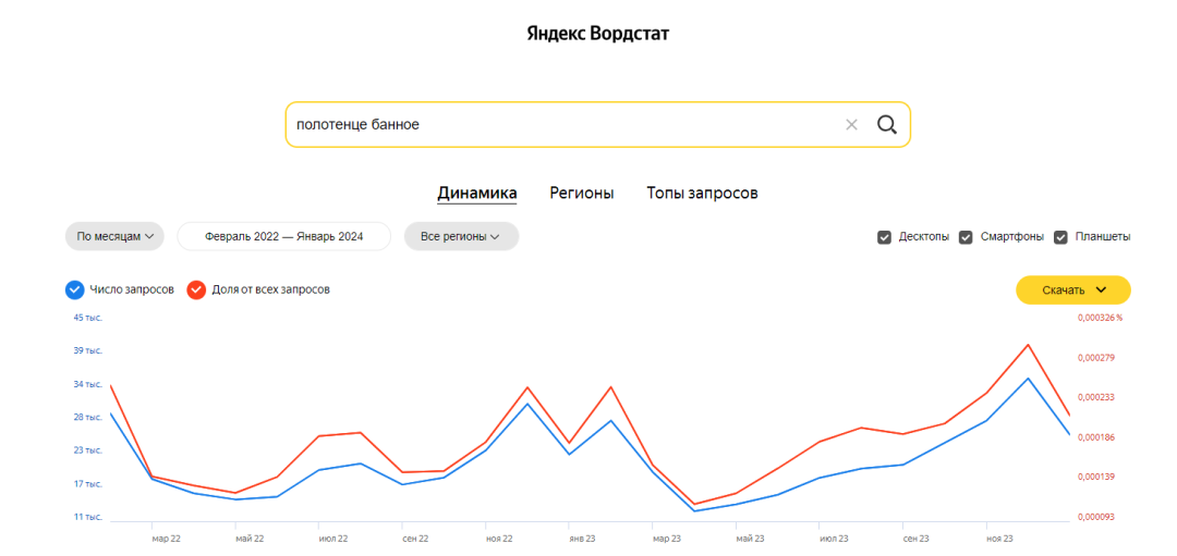 想精准判断需求波动,可借助 Yandex Wordstat 工具:输入 “浴巾” 或 “банные полотенца”,即可查看关键词不同时段搜索量。