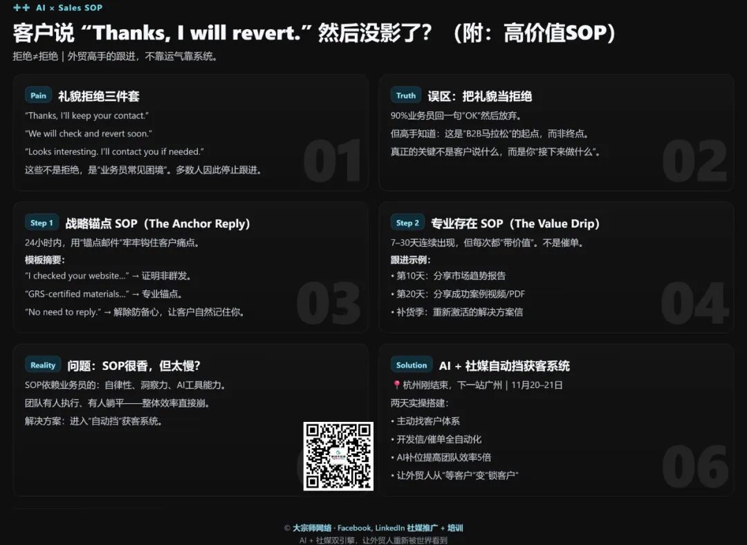 销售这个事,从来都不是只靠我们两句大白话就能完成的。把所有的跟进都变成“高价值”跟进,这才是专业外贸人该有的“SOP思维”!