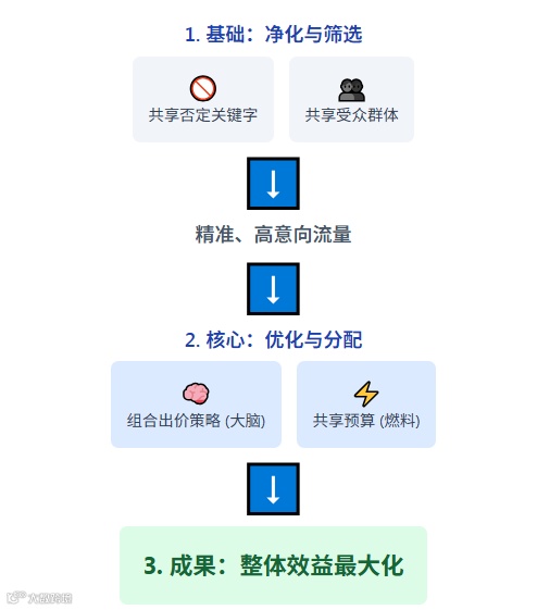 在日常运营中,共享否定关键字列表和共享受众群体是提升效率和保证流量质量的基础;而在追求整体效益时,共享预算和组合出价策略能够赋予系统更多协同优化的能力,以让我的账户预算能灵活地追逐最高的转化机会,真正的实现账户管理从“部件”到“系统”的升级。
