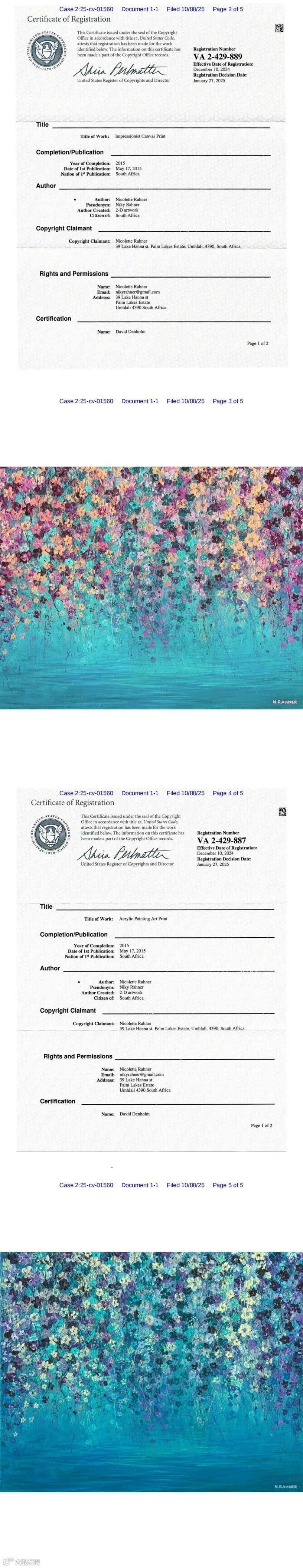 原告 NICOLETTE RAHNER 是一位深受创作自由和对自由绘画的热爱影响的艺术家,其作品曾在南非的多家画廊展出。