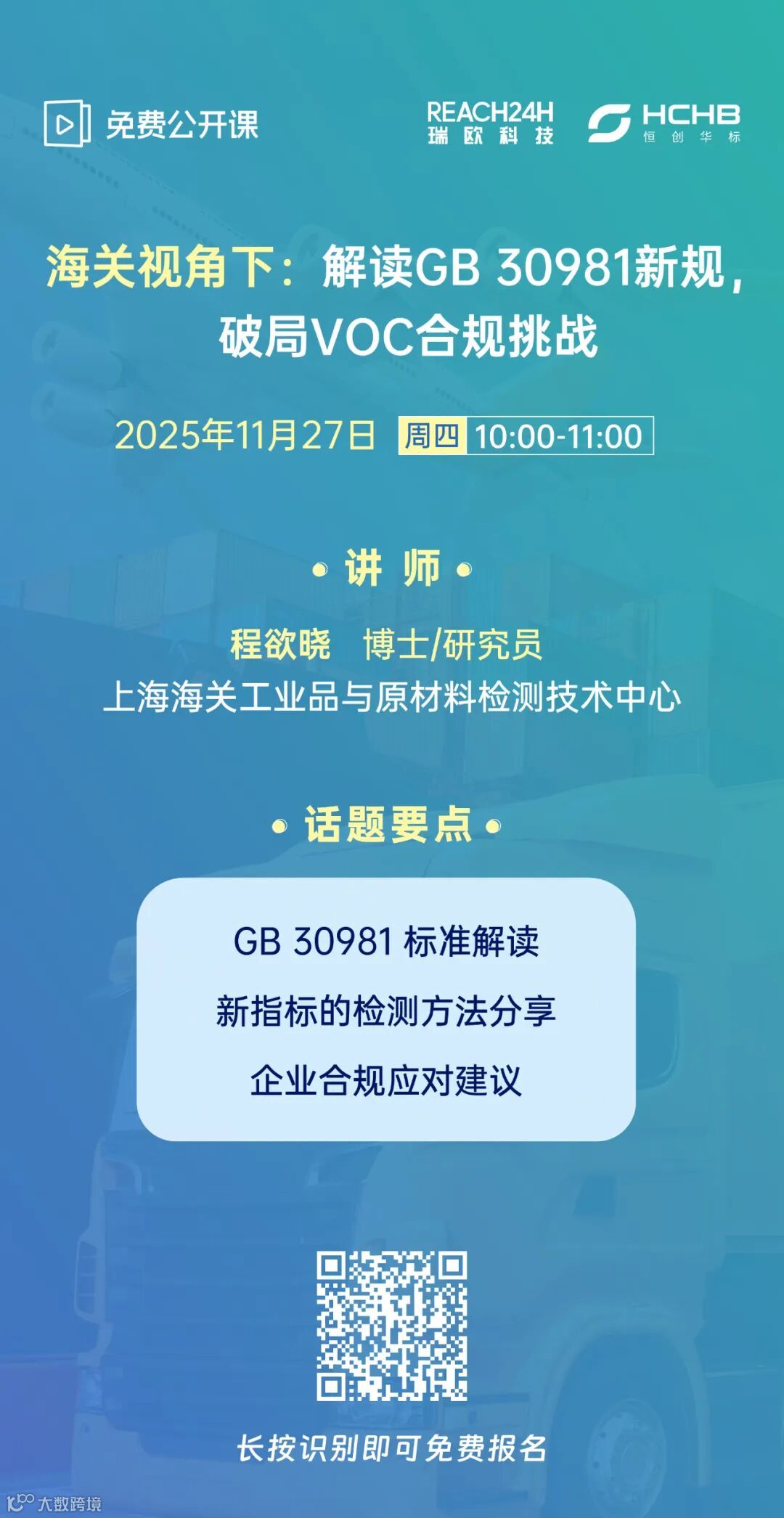 为帮助相关企业深入理解新规要点、破解合规难题,瑞欧科技携手恒创华标,特别邀请到上海海关工业品与原材料检测技术中心的程欲晓博士,于 2025 年 11 月 27 日(周四)带来以「海关视角下:解读 GB 30981 新规,破局 VOC 合规挑战」为题的线上研讨会——