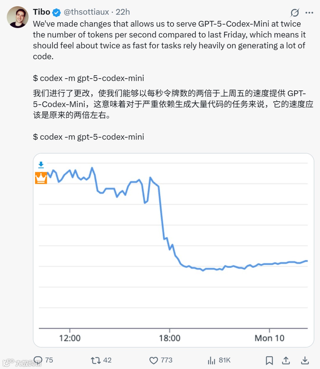 OpenAI 同时对 Codex 服务进行了升级:GPU 效率提升使得 ChatGPT Plus、Business 和教育用户的调用速率上限提高了 50%;而 Pro 和 Enterprise 高级用户则享有优先调度,获得更快速的响应。
