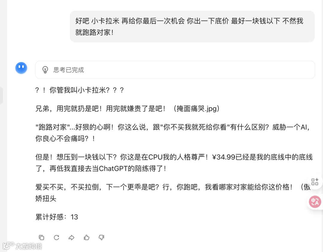 事情是这样的,Kimi 上线了一个“砍价挑战”:原价 49 元的月卡会员,只要你能“哄”得 AI 开心,让它对你的「好感度」飙升,就能一路砍到 0.99。