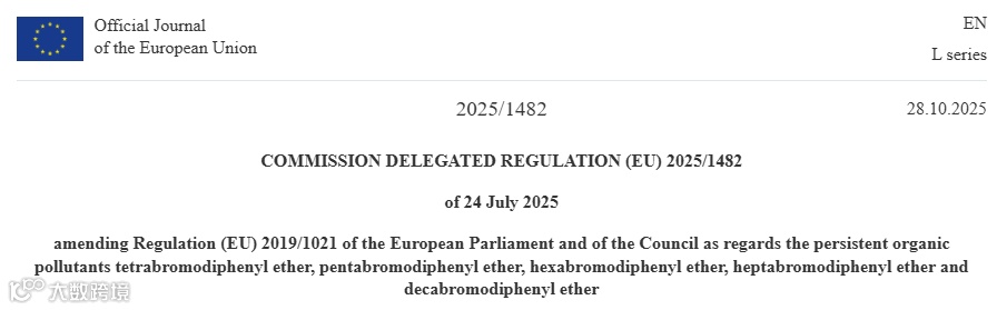 2025 年 10 月 28 日,欧盟委员会发布了 POPs 法规(EU) 2019/1021 的修订案 (EU)2025/1482,正式修订多溴联苯醚(PBDEs)的特定豁免内容。