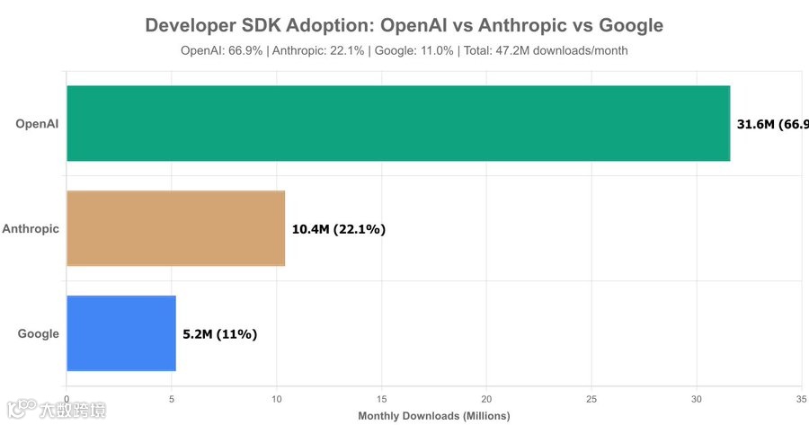 OpenAI 月度 SDK 下载量: 高达 3160 万 (碾压式占比 66.9%)