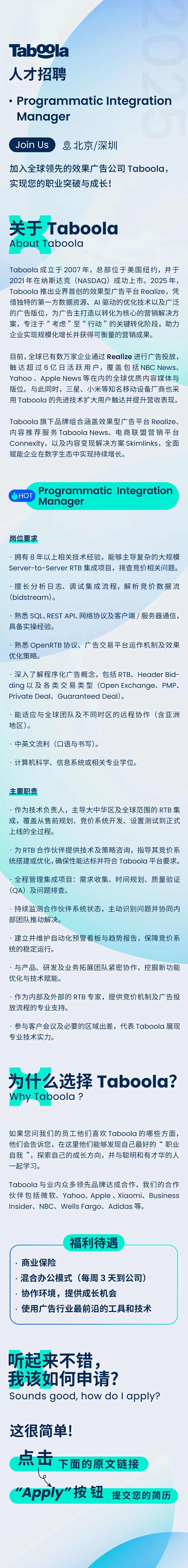 人才招聘|Programmatic Integration Manager - Taboola 北京/深圳岗位