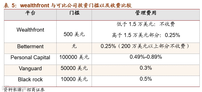 收费模式:相较传统模式,费率简单透明。Wealthfront的收费主要包括两部分:1)ETF运营费,一般平均费率为基于管理规模的0.12%/年,这部分收入是归基金公司所有;2)资产管理费:公司为对客户的账户进行管理,包括下单、实时跟踪和调仓,通过收取资产管理费获得收入,基于管理资产规模的收取标准为1.5万美元以下部分免费,1.5万美元以上部分收取0.25%/年。除了归属于基金公司的部分,对于其它增值服务不收取任何费用,公司采用单一费率模式而且费率较低。传统投顾服务收费项目繁多且极不透明,往往会收取咨询费、交易费、投资组合调整费用、隐藏费用、零散费用等近十类费用,总费率高达1%以上。