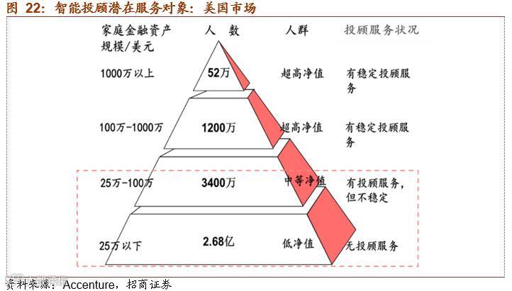 中低净值客群基数大,投顾需求强:在财富管理行业,传统的银行信托等金融机构的财富管理业务占领了高净值的客户,而中低净值的群体无法承受传统投顾服务的高额成本。而根据Accenture的数据,美国25万美元以下金融资产的家庭占比约为85%,这表明传统投顾模式下,只有极少数人可以获得投顾服务。公司将客户定位于中低净值人群,一方面可以规避与传统金融机构的竞争;另一方面,长尾用户单价值虽然不高,但总需求庞大。这也是公司在13年以后能迅速做大的重要原因。