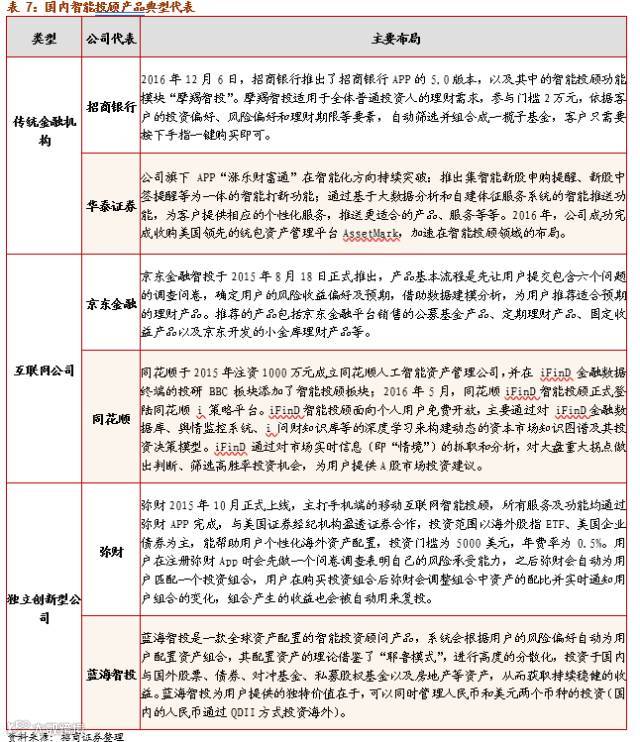 第三类:则是传统的金融机构提供的智能投顾服务,例如招商银行APP里的摩羯智投、华泰证券收购AssetMark等。