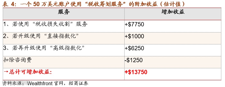 税收筹划业务即通过“合理避税”来提高投资者的收益水平。除了智能投顾平台普遍能够提供的税收损失收割业务之外,Wealthfront通过对算法的进一步改进,推出了升级版的直接指数化和高级指数化业务,其差异主要体现在美国股票的投资标的选择上。通过更为细致地股票投资,可以更好地挖掘税收损失收割的机会,进一步提升投资者的收益水平。这两项改进业务设置有投资门槛,直接指数化业务要求资产规模在10万美元以上,高级指数化业务要求资产规模在50万美元以上。