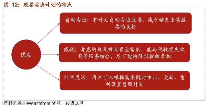 股票卖出计划是帮客户将手中的股票逐步以无佣金、低税的方式卖出,并分散投资到多种类型的ETF中。当投资者手中持有大量单支股票(主要是原始股)时,不仅无法获得分散化投资带来的低风险的好处,在卖出时还往往会造成市场冲击而压低卖出价格。Wealthfront根据用户短期资金需求和长期投资计划,为用户提供一定时间内逐渐卖出一定数量该公司股票的服务,并将卖出股票获得的现金投资于用户的分散化投资组合。该服务免收费用及佣金。