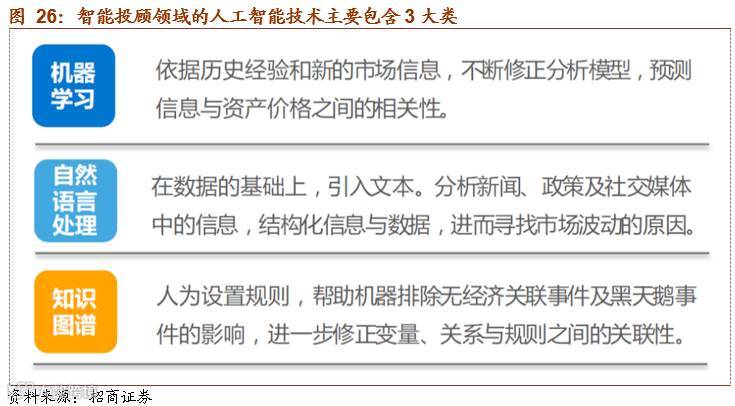 核心要素二:人工智能。在获取相应的数据和信息后,智能投顾将借助人工智能技术对这些数据进行系统化的筛选、处理与解析,最终得出资产配置和再平衡的决策。就智能投顾领域人工智能技术而言,目前主要分为三大类:1)机器学习:通常是在对财务、交易数据建模后,利用回归分析等传统机器学习算法预测交易策略,代表公司有Alpaca、AIDYIA、CASTILLIUM等;2)智能语义分析:在数理回归模型基础上,引入新闻、公告、社交媒体中的文本信息,并运用自然语义处理技术将其解析为结构化数据,作为建立投资决策重要参考信息源,代表公司有KENSHO、CommEq等;3)知识图谱分析:本质上属于语义图谱网络,加入相关专家设计的规则,将投资标的相关因子的逻辑关系以知识图谱的形式表现出来,从而能进行更深入推演处理,代表公司有garlik以及国内公司文因互联等。