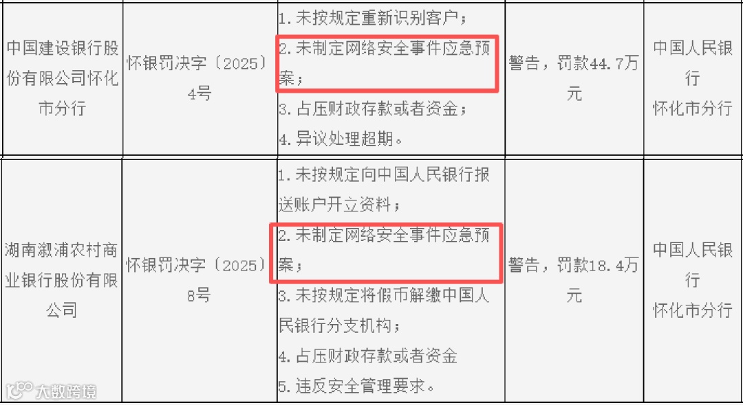 9月15日,中国人民银行怀化市分行发布的行政处罚信息显示:建设银行怀化市分行因“未制定网络安全事件应急预案”等4项违法行为,被警告,并被罚款44.7万元;湖南溆浦农商银行因“未制定网络安全事件应急预案;违反安全管理要求”等5项违法行为,被警告,并被罚款18.4万元。
