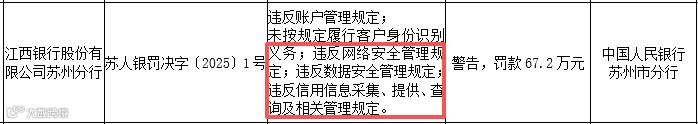 10月17日,中国人民银行苏州市分行发布的行政处罚信息显示,江西银行苏州分行因“违反网络安全管理规定;违反数据安全管理规定;违反信用信息采集、提供、查询及相关管理规定”等5项违法行为,被警告,并被罚款67.2万元。