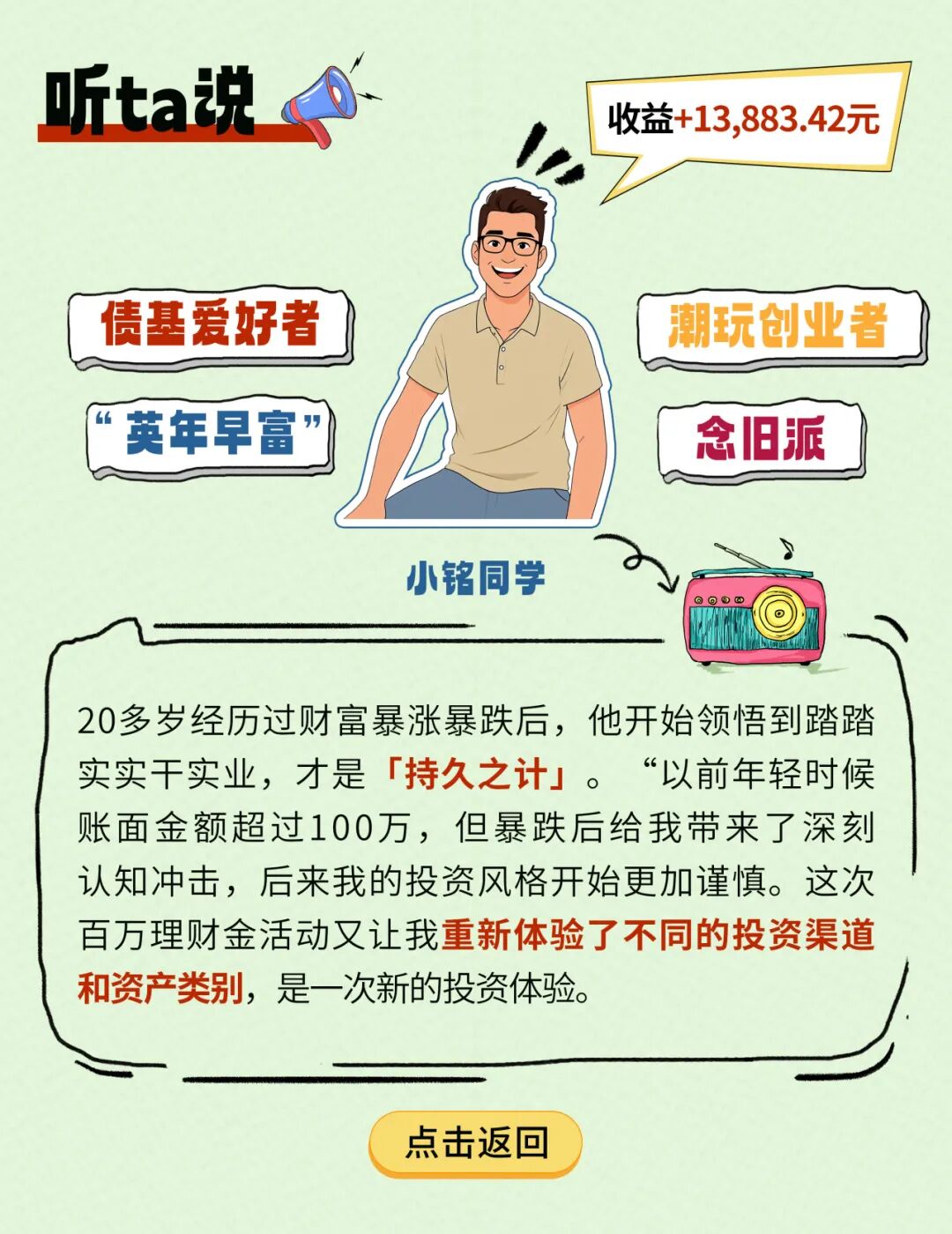 腾讯理财通“百万理财金”活动完美收官!这场为期30个交易日的创新投教活动,由腾讯理财通平台向用户累计发放超10亿元虚拟理财体验金,用户0成本养基,“赚了算你的,亏了算我的”,吸引到了超100万位用户参与!