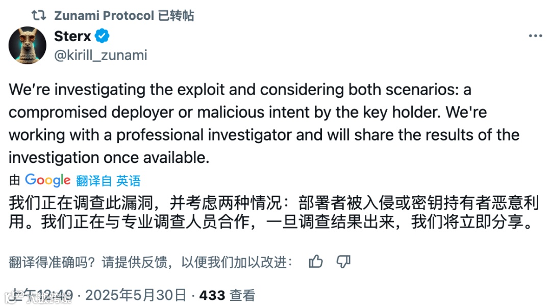 5 月 30 日,Zunami Protocol 创始人 @kirill_zunami 发推表示正在调查此次攻击事件,并同步考虑两种可能的情况:部署者密钥被盗,或密钥持有者存在恶意行为。