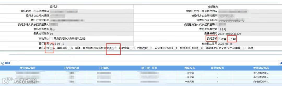 查到后,在报关行名称前打勾,点《发起委托申请》。然后《委托关系有效期》选12个月, 《自动确认》一定要打勾!一定要打打勾, 《委托方式》选"长期",委托内容这块要有勾选。一般勾选A,C。最后右上角点《发起》,就成功了!