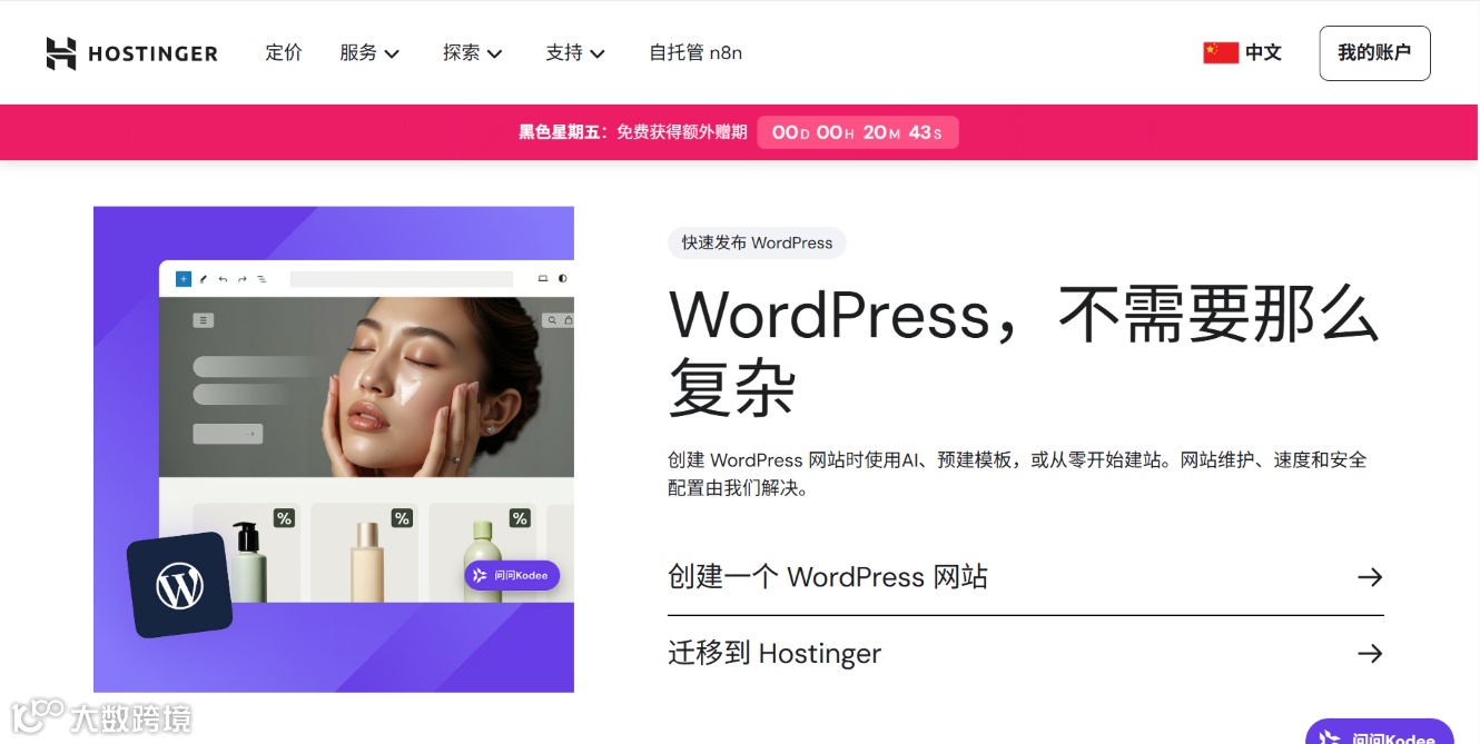推荐 Hostinger:性价比高,提供 LiteSpeed、免费 SSL、一键 WordPress。