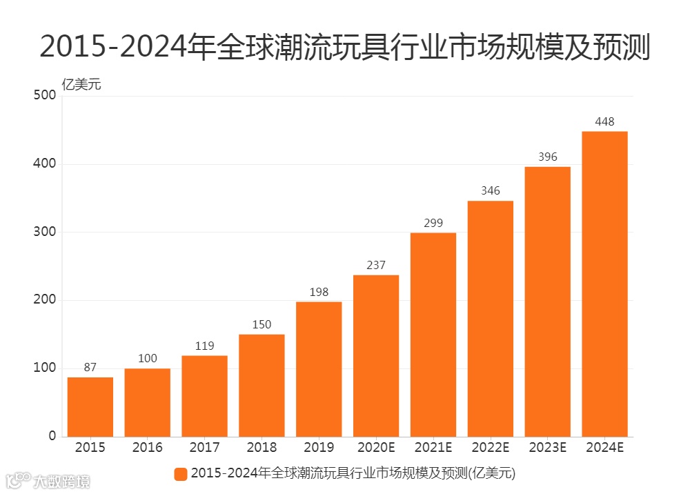 根据数据显示,全球潮流玩具市场规模从2015年的87亿美元增长到2019年的198亿美元,预计2024年规模将达到448亿美元。