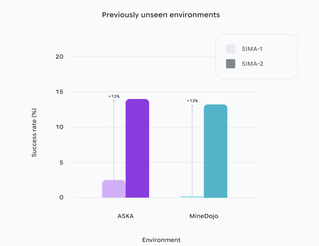 此外,它的泛化性能得到巨大飞跃,与前代产品相比,SIMA 2现在能够理解更冗长、复杂、更细致的指令,并且在执行这些指令方面更加成功,尤其是在从未接受过训练的场景或游戏中。