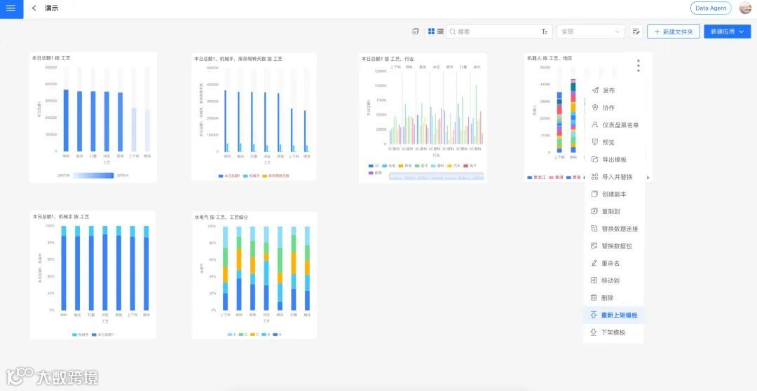 当应用内容更新时,分析师可通过原路径快速完成「重新上架」或「下架」操作,确保模板市场中的资产始终精准可用。配合标签自动显隐机制,实现模板资产的动态优化管理。