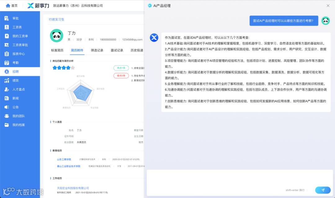 【致远薪事力】近期,致远薪事力 AIGC 能力的全面接入,在招聘领域开启了从量到质、从效率到效能的全面升级之路。AI 到 AIGC 升级,这一次将为HR带来能协助输出内容、出谋划策,真正聪明、高效、懂需求、实时交互的人性化助手;这一次的升级还将带领 HR 进行身份转变,AIGC 强大的自学习能力,让其从海量的人力资源招聘数据中学习并不断进化升级,HR 更加从容应对各项日常招聘中的重复性工作,站在更高的位置推动招聘决策,创造更大的价值。