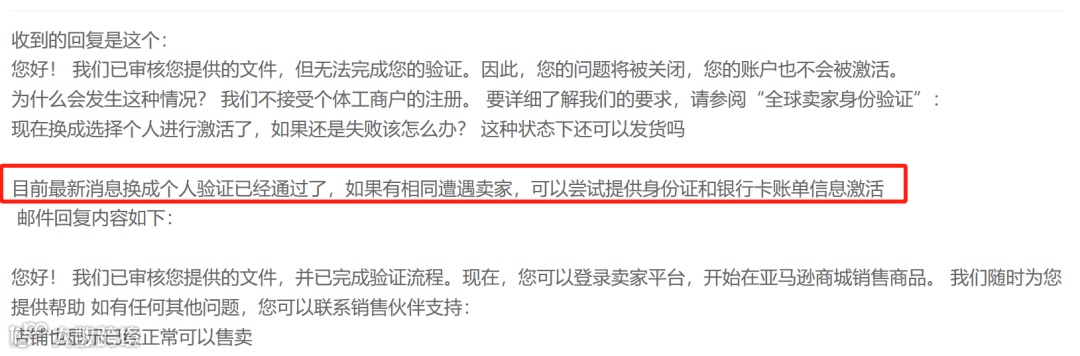 亚马逊卖家朋友圈消息-个体工商卖家在提交账户审核文件后,收到亚马逊通知“无法完成验证”的邮件。邮件中明确指出了拒绝的原因:亚马逊不接受个体工商户的注册。