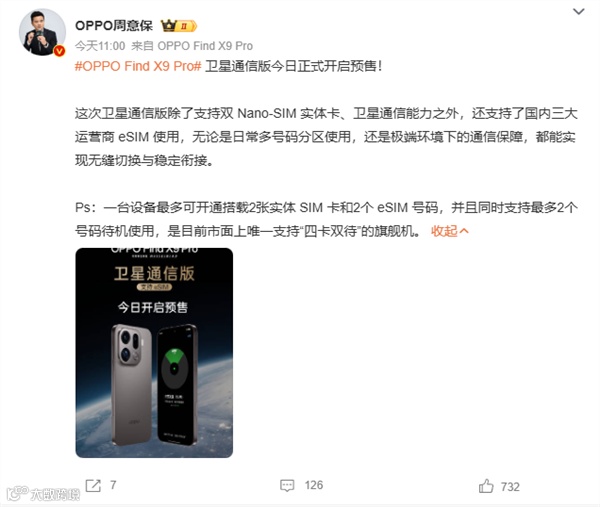 快科技11月14日消息,OPPO Find X9 Pro卫星通信版今天正式开售,这是国内首款支持eSIM的国产手机,16GB+1TB售价6999元。