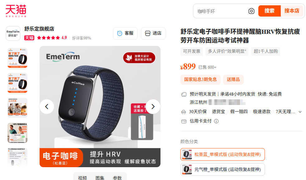 据商家介绍,“手环通过低频电脉冲刺激内关穴,精准传达至正中神经,激活信号向迷走神经传递,促进脑部供血供氧量,提高兴奋性神经质,增强副交感神经活动,改善HRV平衡,起到一个快速提神醒脑的作用。”