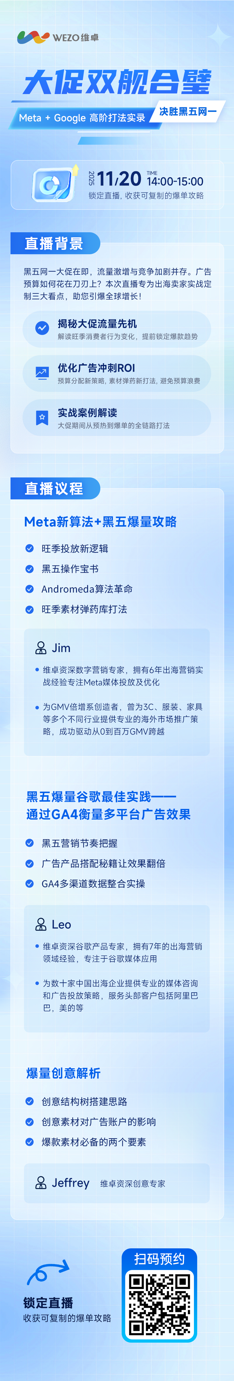 黑五网一的窗口期只有一次,但跑顺的一套大促打法,可以陪你打完下一次、下下次大促。11 月 20 日 14:00–15:00,来听维卓如何用 Meta x Google 高阶策略,打赢今年的黑五网一!本周四,我们在直播间等你不见不散!