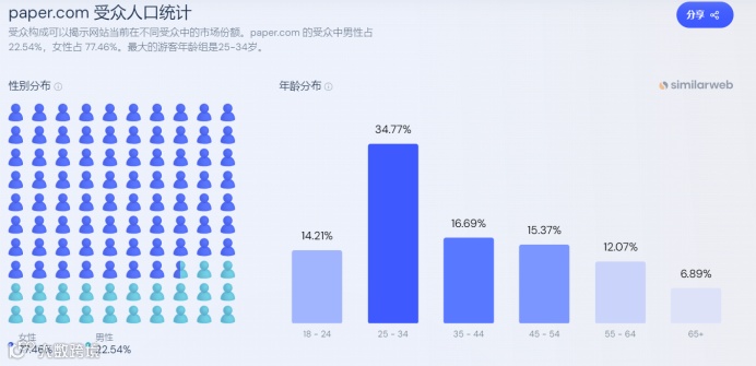 根据similarweb数据显示,Papier品牌独立站平均月访问量达89.23万人次,其中女性用户占比77.46%,男性用户占比22.54%,25——34岁的用户居多,占34.77%,可见,Papier文具品牌深受Z世代年轻女性的青睐。