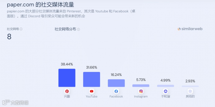 根据similarweb数据显示,Papier品牌流量来源于Pinterest、YouTube、Facebook、Instagram等海外流行社交媒体,分别占比38.44%、31.66%、16.24%、5.73%,Papier将产品以图片或视频的形式呈现给用户,通过视觉效果吸引用户下单购买。