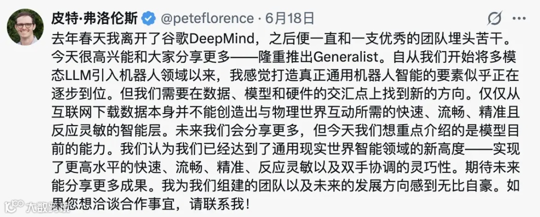 今年六月,皮特在社交媒体上公开表示,自己去年春天离开了谷歌DeepMind,之后一直与一支新的出色团队埋头苦干。